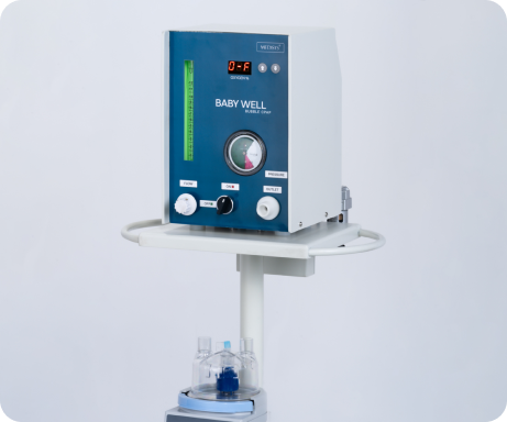 With built-in turbine for the source of air it is quite innovative in design and concept. The approach makes it very compact and cost effective to treat the newborns suffering from Infant Respiratory Distress Syndrome. It is based on the usual concept of providing CPAP maintaining a continuous flow of blended gas in the patient circuit and exiting through a water column. Blending of air and oxygen is done by an electronic blender with a digital display. Most importantly, air is supplied by a built-in turbine and the need for attaching a bulky compressor is avoided. The unit comes in all-in-one pack comprising of the Air Turbine, electronic blender, flow controller, servo controlled humidifier, heated breathing circuit, patient manifold and the pressure generator.