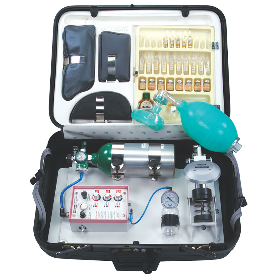 MEDISYS Emergency kit is specifically designed to meet all such emergency situations where respiratory support in the form of Controlled Mechanical Ventilation (CMV), Automatic IPPR or continuous Oxygen Inhalation therapy is needed. The unit is supplied with a pneumatically controlled time cycled ventilator, having only three controls for regulating Insp. Flow, Exp. Time & Insp. Time. In addition, provision of pneumatic suction and delivery of 100% oxygen makes it an ideal choice for taking care of any type of medical emergency.